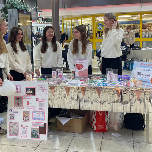 De leerlingen van Harmony Cups (Aletta Jacobs College) stonden deze middag zonder fysiek product op de markt, omdat het prototype nog in ontwikkeling is, maar mét een missie: lingerie aangenaam en comfortabel maken voor alle vrouwen. "Kankerpatiënten hebben soms te maken met een verschil in borstgrootte," legden Mischa, Isabel, Thijmen en Ryan uit. Hun product HarmonyCups maakt het mogelijk om verschillende cupgroottes te combineren in 1 bh, en hier gemakkelijk in te kunnen wisselen. "Ziekenhuizen bieden iets dergelijks al aan, maar dit is kostbaar, wordt niet altijd vergoed door verzekeraars, en het is alleen verkrijgbaar in beige en wit," aldus de leerlingen; "daar willen wij verandering in brengen."